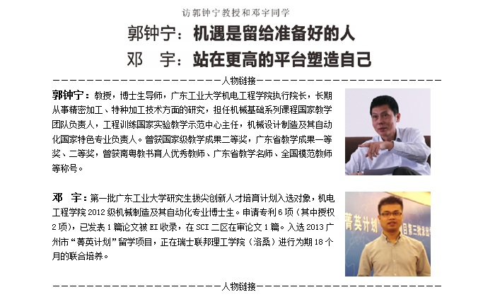 正如邓宇所说的:“我将凭着自己踏实的学习精神和用心钻研专业的品质来影响带动身边的人。”“广东工业大学拔尖创新人才培育计划”不断为更多的培育对象提供优质资源和平台,保证优秀的人继续走下去,同时也通过营造浓厚的学术气氛激励和鼓舞更多的研究生进入研究——对于有志于潜心学习和研究的学生,从不缺少机遇和平台!