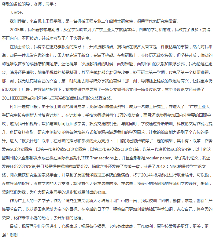 培育对象在“2013年广东工业大学学生工作总结暨学风建设表彰大会”上的发言