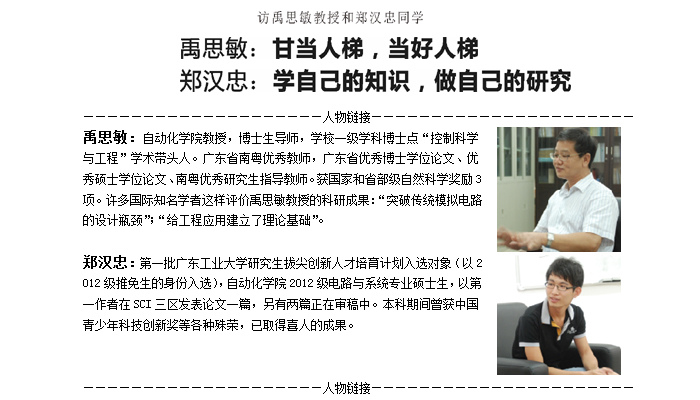 2012年4月27日在“广东工业大学拔尖创新人才培育计划”启动仪式上,禹思敏教授和郑汉忠同学作为入选对象代表之一与陈新校长签订了 “广东工业大学拔尖创新人才培育计划培养协议”,那一幕还像昨天发生的一样历历在目。如今,一年多过去了,禹思敏教授和郑汉忠同学在磨合中深入对混沌领域的研究,这一对都曾经被无数光环所笼罩的师生俩,在培育计划渐臻佳境之时,感慨良多。