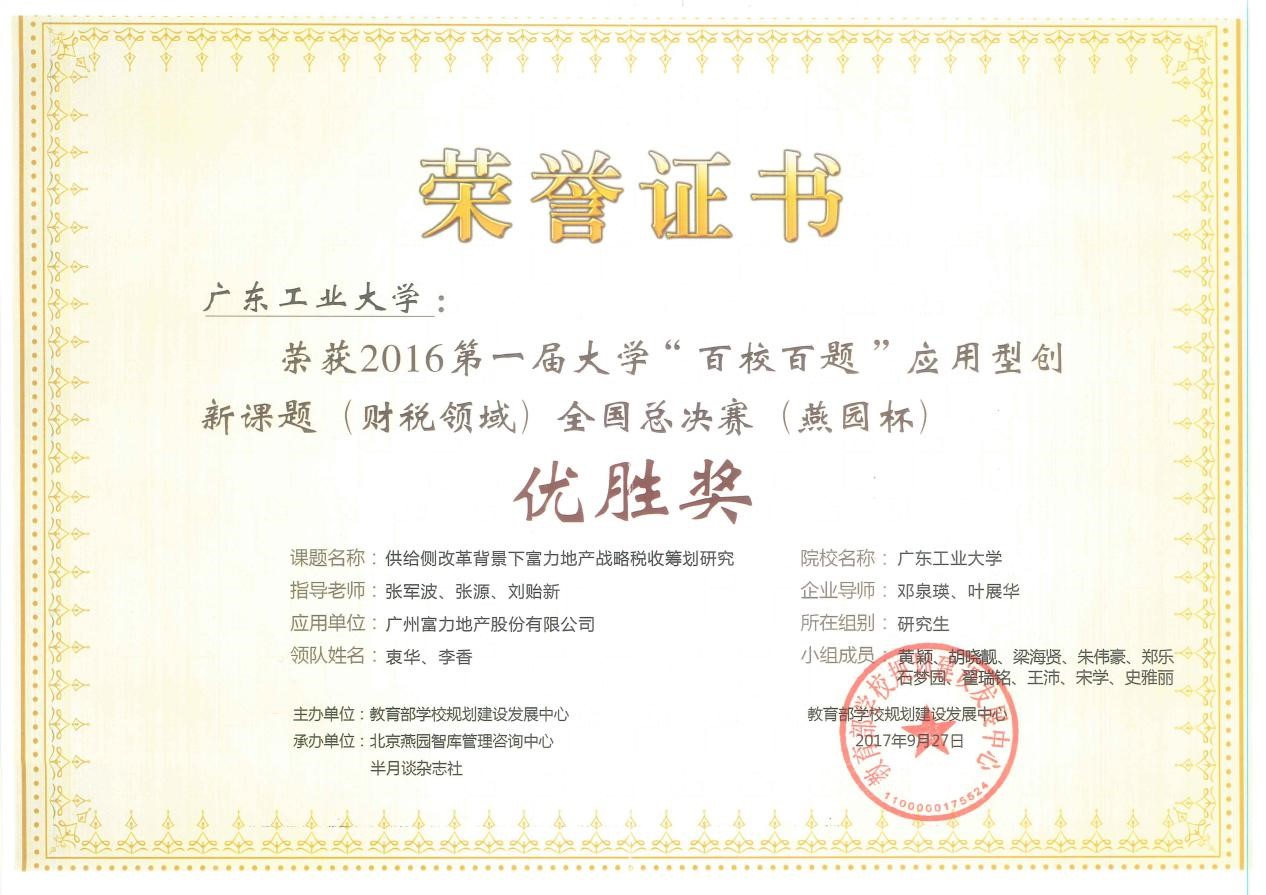 作为国内财税领域大学生的顶级赛事,“百校百题”应用型创新课题(财税领域)大赛旨在推动产教融合、校企合作、校地合作,使高等教育真正服务于地方区域经济的发展,打造中国财税教育生态化新平台。对此,我校高度重视,由研究生院和管理学院牵头组建了一支由MPAcc(会计硕士)研究生为核心的参赛队伍(组员包括石梦园、翟瑞铭、郑乐、史雅丽、王沛等研究生和朱伟豪、黄玥琳、胡晓靓、黄颖等本科生)。在管理学院老师(张军波副教授、张源副教授)和广州富力地产高管(邓瑛泉财务总监、叶展华税务经理)共同指导下,参赛队伍克服种种困难,用勤奋踏实、孜孜不倦的钻研精神,深入企业实地调研、反复研读文献资料、分析调研数据,撰写调查报告,顺利闯过初赛及大区复赛,冲入全国总决赛并获得优异成绩,充分展示了我校研究生的风采,也为推动学校专业学位研究生教育改革做了有益探索和实践。