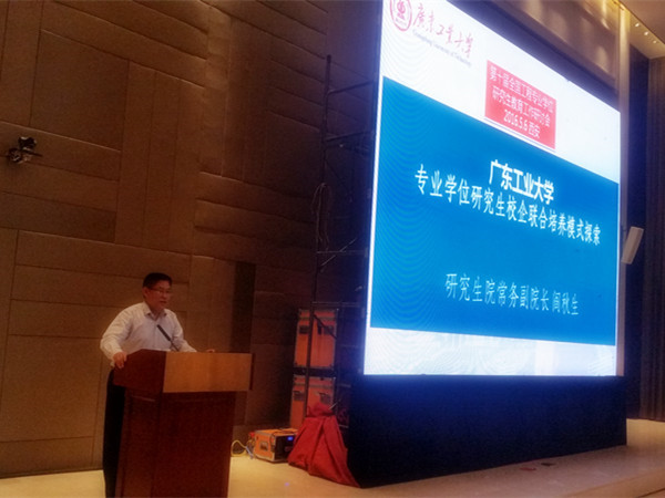 我校研究生院常务副院长阎秋生教授代表我校做了题为“广东工业大学专业学位研究生校企联合培养模式探索”的经验交流报告,从我校研究生教育、联合培养基地建设及其成效、专业学位联合培养模式、经验及思考等四个方面介绍我校的研究生教育改革的经验。重点阐述我校面向高水平大学建设的研究生教育发展举措,针对研究生培养的改革,构建与实践“顶天式”知识创新人才与“立地式”技术创新人才的多模式培养体系;探索依托与地方政府和工业界联合建立的跨学科协同创新平台联合培养研究生的机制和模式;基于需求导向学科融合的机器人专业学位研究生培养探索;全国示范性工程专业学位研究生联合培养基地——广东工业大大学/巨轮智能股份有限公司在产学研联合培养专业学位研究生方面的经验介绍。报告得到了全国工程专业学位研究生教育指导委员会秘书处领导的肯定和与会代表的好评。目前我校已经建设研究生联合培养基地89个,其中国家级示范基地1个、省级示范基地27个,为我校专业学位研究生培养提供了良好的条件取得了较好的培养效果,在全国较好的代表性和示范性。
