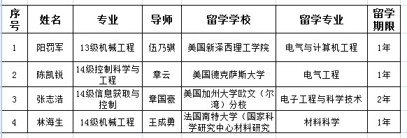 根据国家留学基金管理委员会《关于做好2015年国家建设高水平大学公派研究生项目实施工作的函》(留金发〔2014〕3068号),我校四名博士研究生喜获国家留学基金委公派留学项目资助出国联合培养博士研究生(详情见下表)。这是我校获国家建设高水平大学公派研究生项目资助的又一次突破。希望四位同学在国外认真学习,把握机会,争取早日学成回国,为祖国的建设贡献自己的力量!