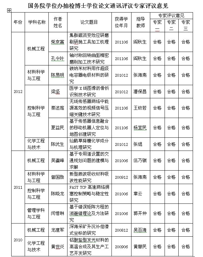接国务院学位委员会办公室“关于反馈2012年博士学位论文抽检通讯评议结果的通知”(学位办[2013]32号)文件,我校被随机抽检的机械工程等学科的7篇博士学位论文,全部一致通过专家合格评审。自2010年以来,国务院学位办每年从国家图书馆直接随机调取各学位授予单位的博士学位论文,每篇论文送请3位专家通讯评议,专家对每篇论文按照“合格”、“不合格”两档进行评价。我校在2010年、2011年和2012年连续三年被国家随机抽检的博士学位论文,专家评审全部合格,合格率100%。这表明了我校授予博士学位质量符合国家要求。